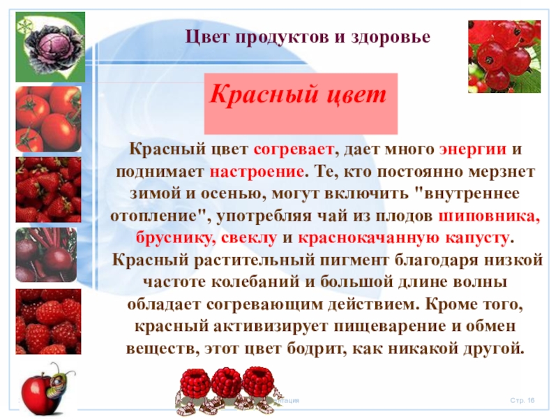и поднимает настроение. Те, кто постоянно мерзнет зимой и осенью, могут включить "внутреннее отопление", употребляя чай из плодов шиповника, бруснику, свеклу и краснокачанную капусту. Красный растительный пигмент благодаря низкой частоте колебаний и большой длине волны обладает согревающим действием. Кроме того, красный активизирует пищеварение и обмен веществ, этот цвет бодрит, как никакой другой.