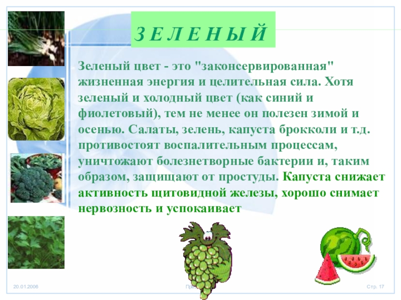 "законсервированная" жизненная энергия и целительная сила. Хотя зеленый и холодный цвет (как синий и фиолетовый), тем не менее он полезен зимой и осенью. Салаты, зелень, капуста брокколи и т.д. противостоят воспалительным процессам, уничтожают болезнетворные бактерии и, таким образом, защищают от простуды. Капуста снижает активность щитовидной железы, хорошо снимает нервозность и успокаивает