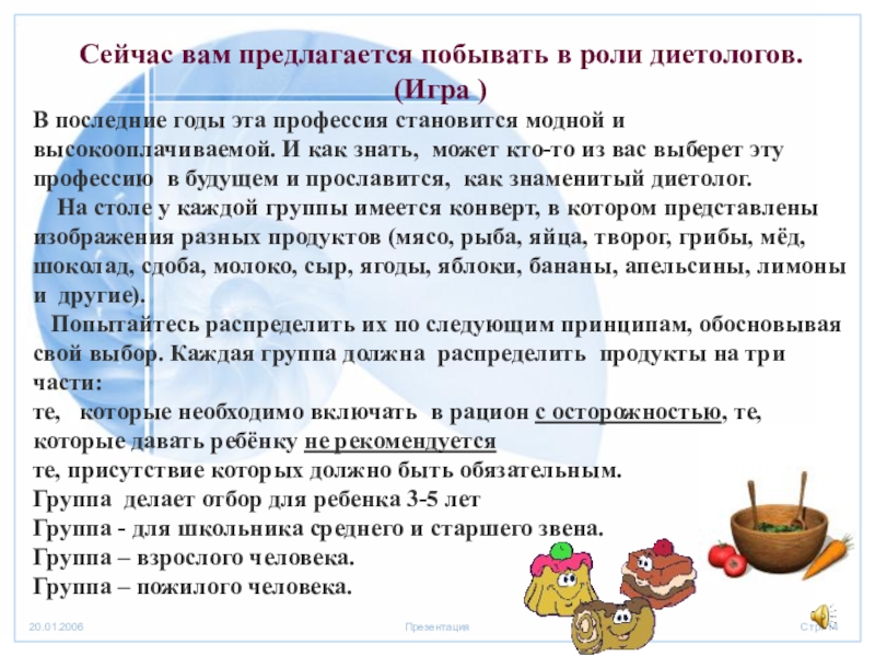 Слайд 14Сейчас вам предлагается побывать в роли диетологов.