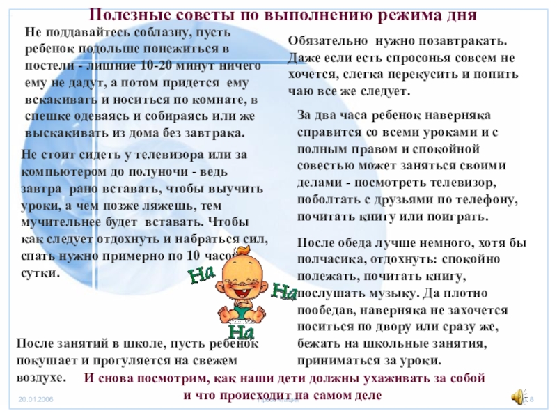 Слайд 8Не поддавайтесь соблазну, пусть ребенок подольше понежиться в постели - лишние