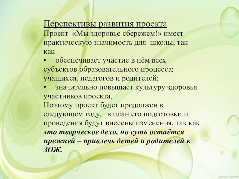 Поэтому проект будет продолжен в следующем году, в план его подготовки и проведения будут внесены изменения, так как это творческое дело, но суть остаётся прежней – привлечь детей и родителей к ЗОЖ.