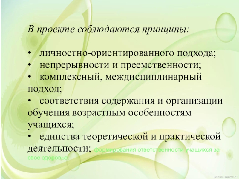 • единства теоретической и практической деятельности; формирования ответственности учащихся за свое здоровье.