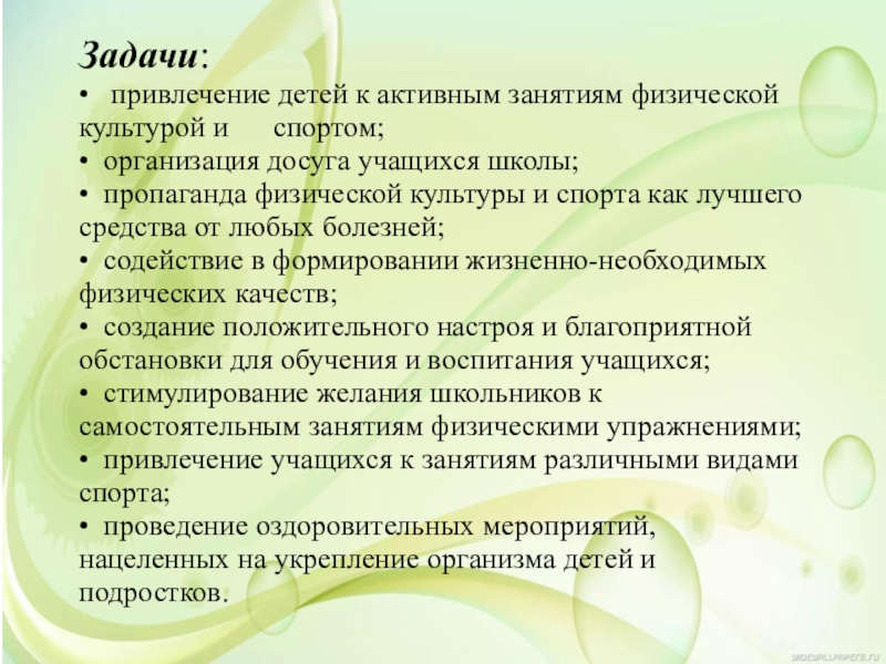 • проведение оздоровительных мероприятий, нацеленных на укрепление организма детей и подростков.