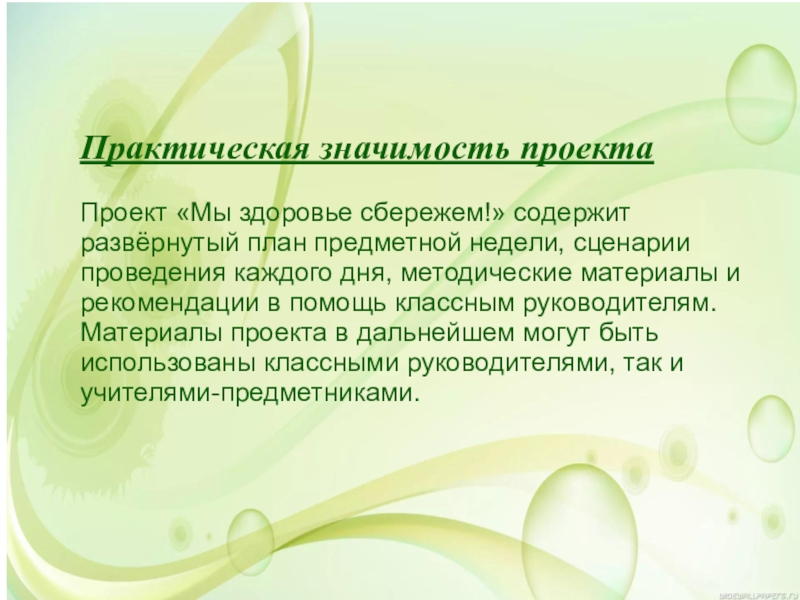 Проект «Мы здоровье сбережем!» имеет практическую значимость для школы,