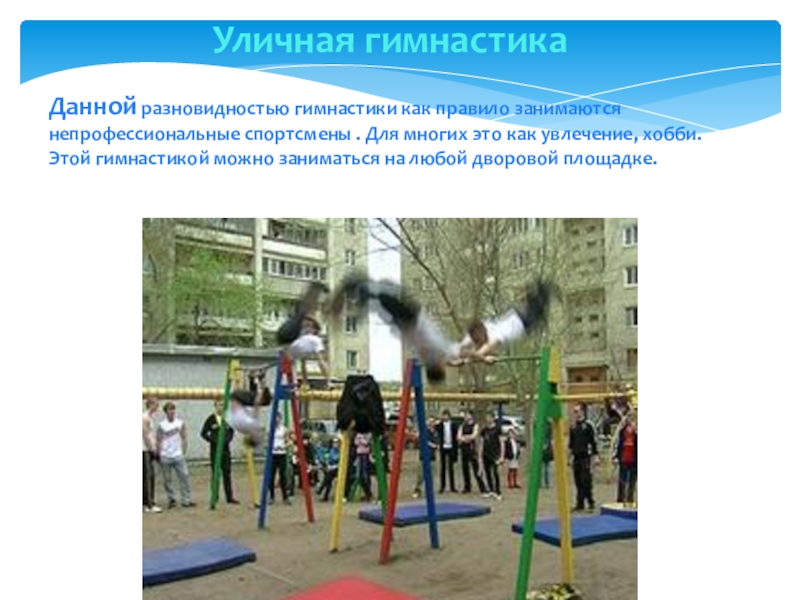 Уличная гимнастикаДанной разновидностью гимнастики как правило занимаются непрофессиональные спортсмены . Для многих это как увлечение, хобби. Этой