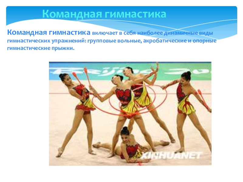 Командная гимнастикаКомандная гимнастика включает в себя наиболее динамичные виды гимнастических упражнений: групповые вольные, акробатические