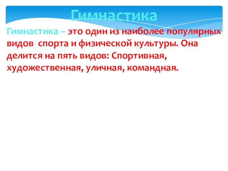 ГимнастикаГимнастика – это один из наиболее популярных видов спорта и физической культуры. Она делится на пять видов: Спортивная, художественная, уличная, командная.