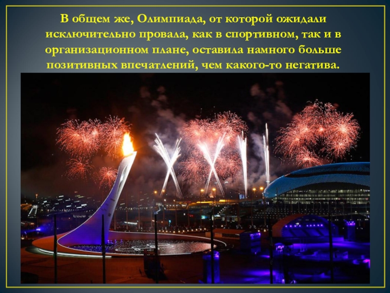 Да, были небольшие организационные шероховатости, связанные с инфраструктурой и размещением. То у подъемника после биатлона столпится очередь на час, не меньше. То у кого-то номер зальёт из-за неправильно и наспех положенной плитки в ванной, то американский бобслеист застрянет у себя в уборной и будет вынужден крушить дверь, чтобы выбраться оттуда. Но глобальных проблем не было. Даже недостроенная деревня для волонтёров почти на границе с Абхазией и недоделанные две с половиной тысячи номеров в Розе Хутор никого особо не напрягли, кроме, собственно, службы размещения. Организаторы выполняли авральный труд, но гости, в подавляющем большинстве, оставались всем довольны.