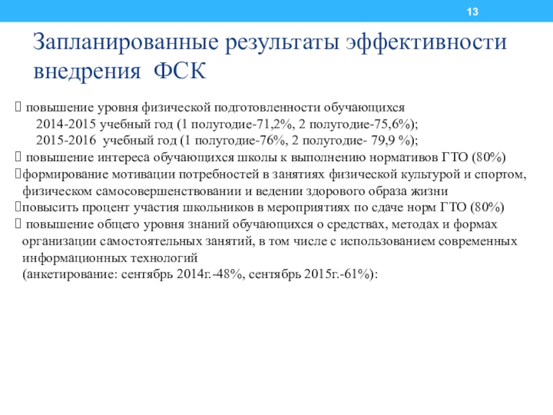 Слайд 13Запланированные результаты эффективности внедрения ФСК