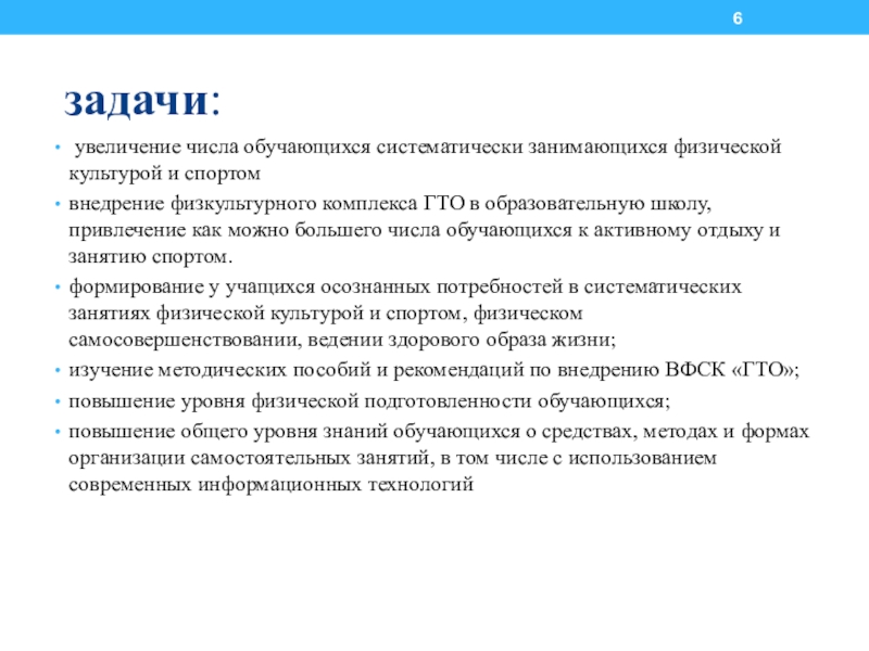 внедрение физкультурного комплекса ГТО в образовательную школу, привлечение как можно большего числа обучающихся к активному отдыху и занятию спортом.