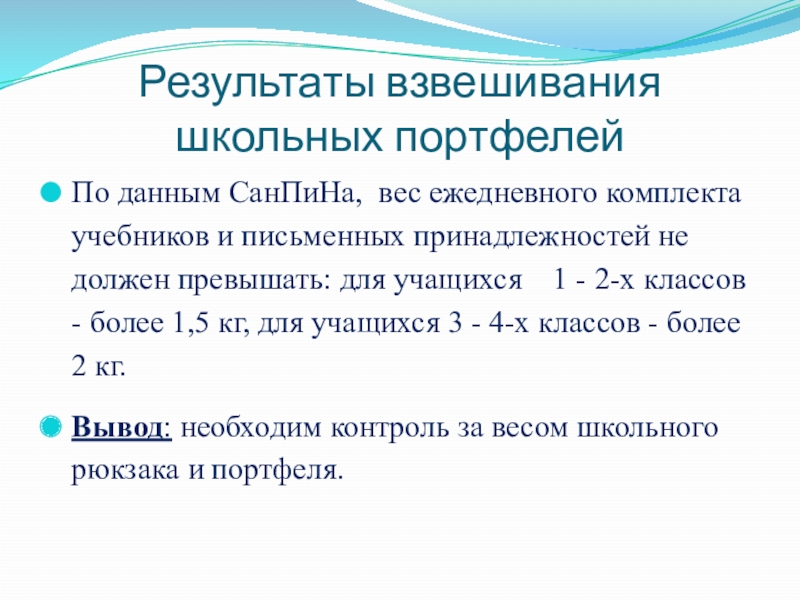 Вывод: необходим контроль за весом школьного рюкзака и портфеля.