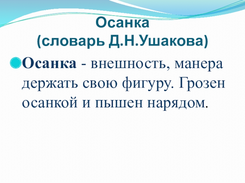 Осанка - внешность, манера держать свою фигуру. Грозен осанкой и пышен