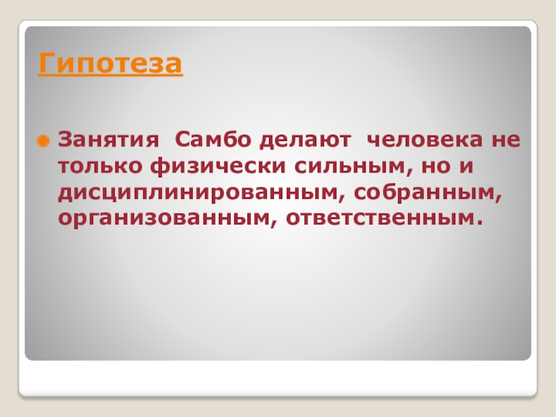 Гипотеза Занятия Самбо делают человека не только физически сильным, но и дисциплинированным, собранным, организованным, ответственным.