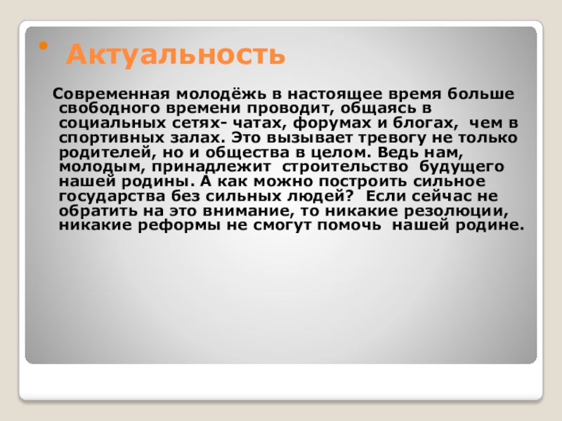 Актуальность Современная молодёжь в настоящее время больше свободного времени проводит, общаясь в социальных сетях- чатах, форумах и блогах, чем в спортивных залах. Это вызывает тревогу не только родителей, но и общества в