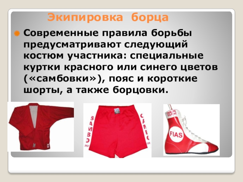 участника: специальные куртки красного или синего цветов («самбовки»), пояс и короткие шорты, а также борцовки.
