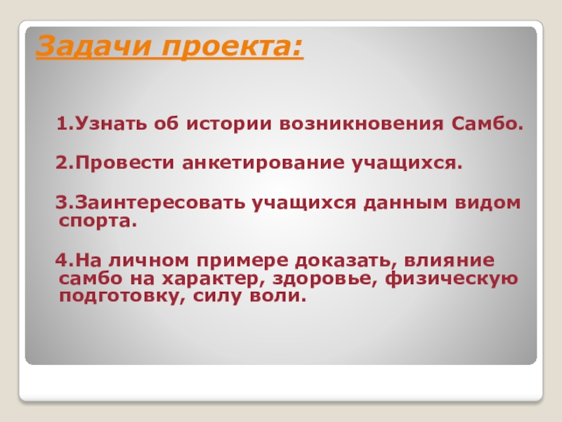 Задачи проекта: 1.Узнать об истории возникновения Самбо.  2.Провести анкетирование учащихся.  3.Заинтересовать учащихся данным видом спорта.