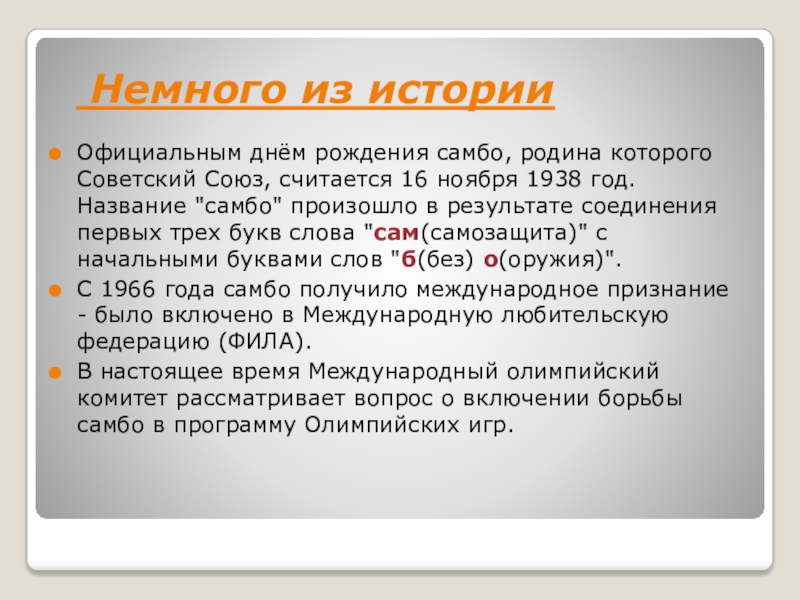 Немного из историиОфициальным днём рождения самбо, родина которого Советский Союз, считается 16 ноября 1938 год. Название