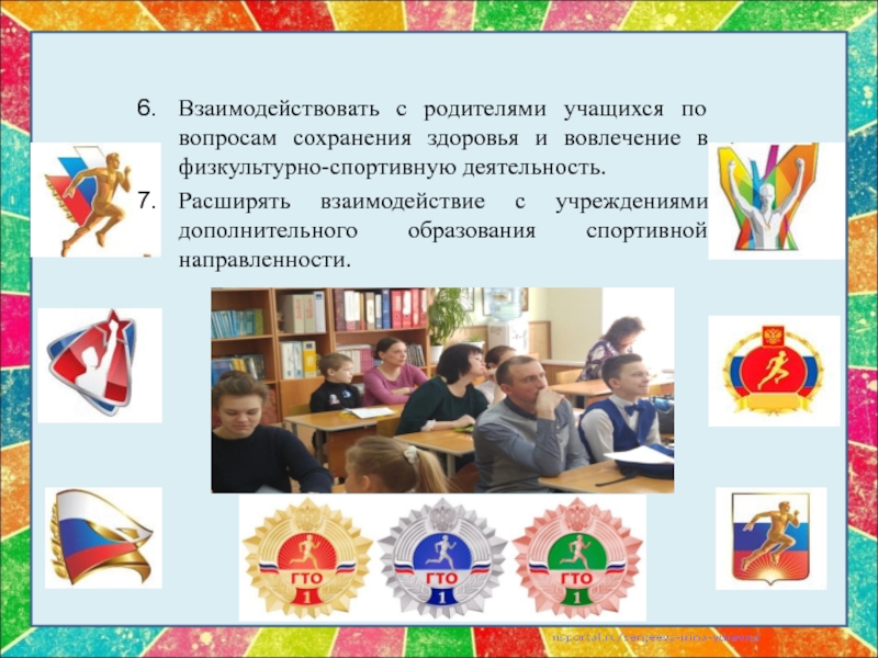 Слайд 6Взаимодействовать с родителями учащихся по вопросам сохранения здоровья и вовлечение в