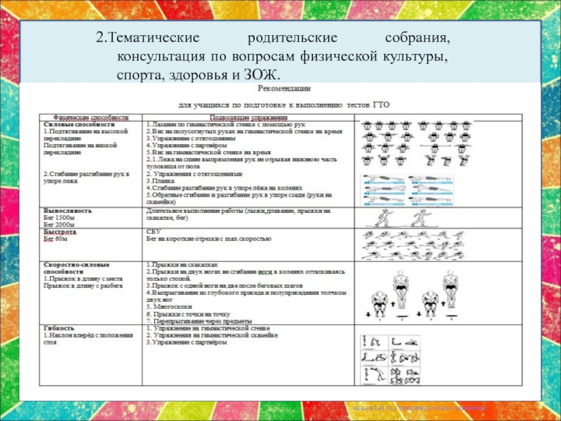 Слайд 92.Тематические родительские собрания, консультация по вопросам физической культуры, спорта, здоровья и