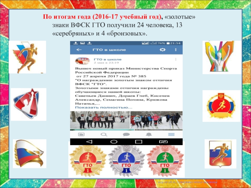Слайд 28По итогам года (2016-17 учебный год), «золотые» знаки ВФСК ГТО получили