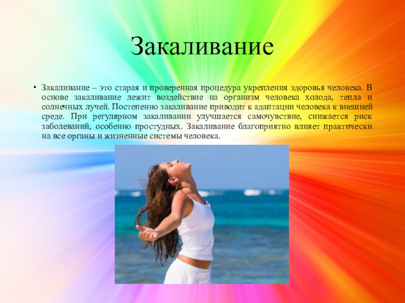 основе закаливание лежит воздействие на организм человека холода, тепла и солнечных лучей. Постепенно закаливание приводит к адаптации человека к внешней среде. При регулярном закаливании улучшается самочувствие, снижается риск заболеваний, особенно простудных. Закаливание благоприятно влияет практически на все органы и жизненные системы человека.