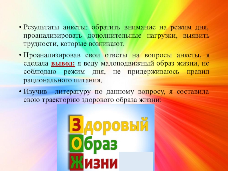 Проанализировав свои ответы на вопросы анкеты, я сделала вывод: я веду малоподвижный образ жизни, не соблюдаю режим дня, не придерживаюсь правил рационального питания.