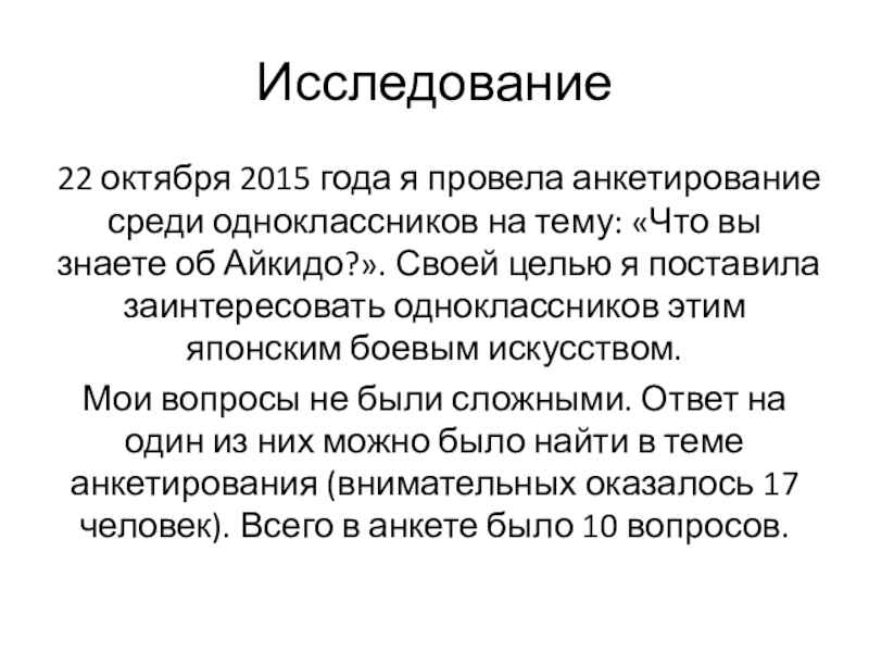 «Что вы знаете об Айкидо?». Своей целью я поставила заинтересовать одноклассников этим японским боевым искусством.