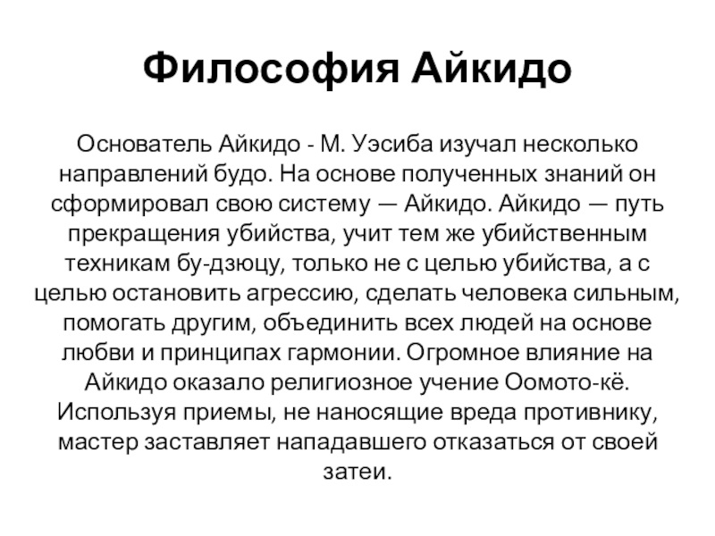 основе полученных знаний он сформировал свою систему — Айкидо. Айкидо — путь прекращения убийства, учит тем же убийственным техникам бу-дзюцу, только не с целью убийства, а с целью остановить агрессию, сделать человека сильным, помогать другим, объединить всех людей на основе любви и принципах гармонии. Огромное влияние на Айкидо оказало религиозное учение Оомото-кё. Используя приемы, не наносящие вреда противнику, мастер заставляет нападавшего отказаться от своей затеи.