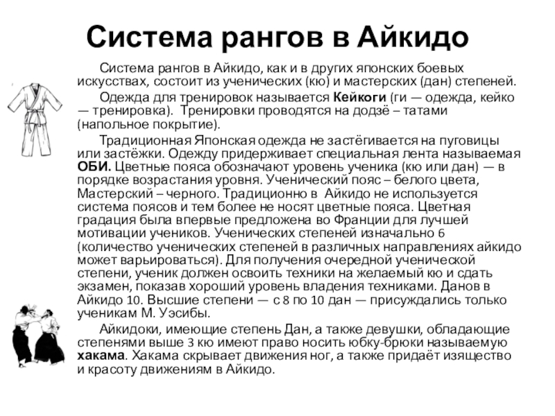 Традиционная Японская одежда не застёгивается на пуговицы или застёжки. Одежду придерживает специальная лента называемая ОБИ. Цветные пояса обозначают уровень ученика (кю или дан) — в порядке возрастания уровня. Ученический пояс – белого цвета, Мастерский – черного. Традиционно в Айкидо не используется система поясов и тем более не носят цветные пояса. Цветная градация была впервые предложена во Франции для лучшей мотивации учеников. Ученических степеней изначально 6 (количество ученических степеней в различных направлениях айкидо может варьироваться). Для получения очередной ученической степени, ученик должен освоить техники на желаемый кю и сдать экзамен, показав хороший уровень владения техниками. Данов в Айкидо 10. Высшие степени — с 8 по 10 дан — присуждались только ученикам М. Уэсибы.