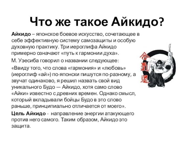 эффективную систему самозащиты и особую духовную практику. Три иероглифа Айкидо примерно означают «путь к гармонии духа».