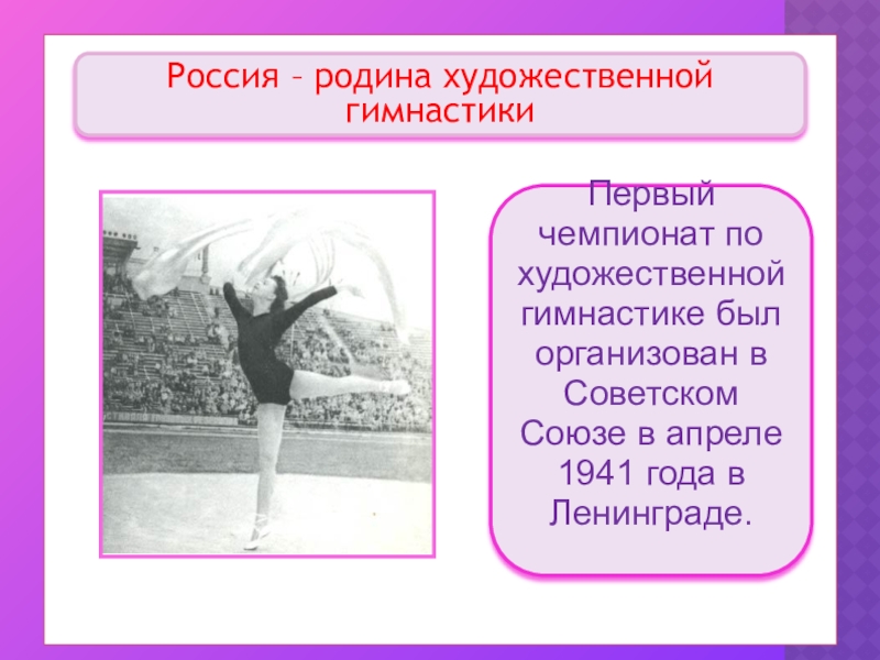 Первый чемпионат по художественной гимнастике был организован в Советском Союзе в апреле 1941 года в Ленинграде.