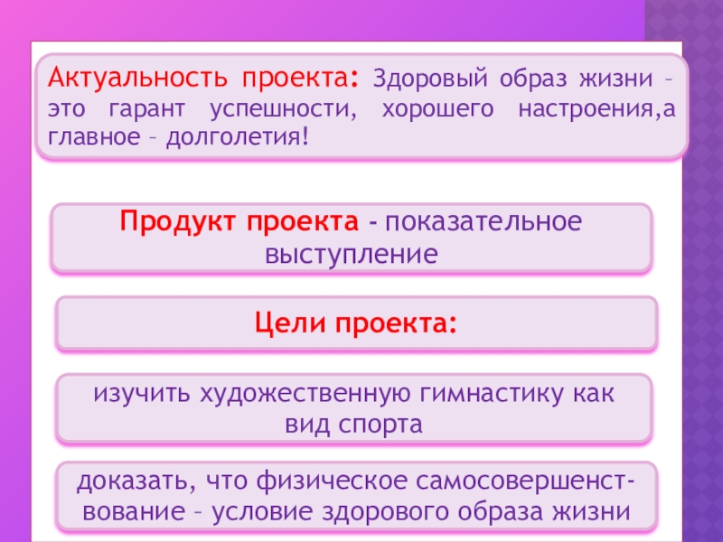 Актуальность проекта: Здоровый образ жизни – это гарант успешности, хорошего настроения,а главное – долголетия!