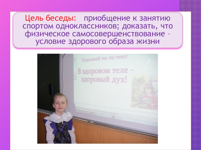 Цель беседы: приобщение к занятию спортом одноклассников; доказать, что физическое самосовершенствование – условие здорового образа жизни