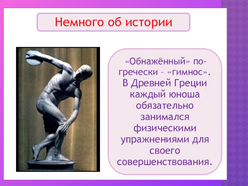 «Обнажённый» по-гречески – «гимнос». В Древней Греции каждый юноша обязательно занимался физическими упражнениями для своего совершенствования.