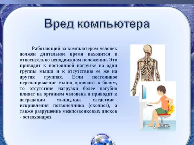 цивилизации компьютер активно вошёл в жизнь каждого школьника. Появилось много интересных компьютерных игр. В результате школьники всё больше времени проводят за компьютером, и в школе, и дома, не задумываясь о вредном влиянии на здоровье. Наибольшая частота изменений в организме отмечается со стороны органов зрения, костно-мышечной и нервно-психических систем.