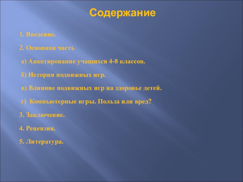 Центральным вопросом исследования является изучение игровых интересов школьников и воздействие на организм детей компьютерных и подвижных игр.
