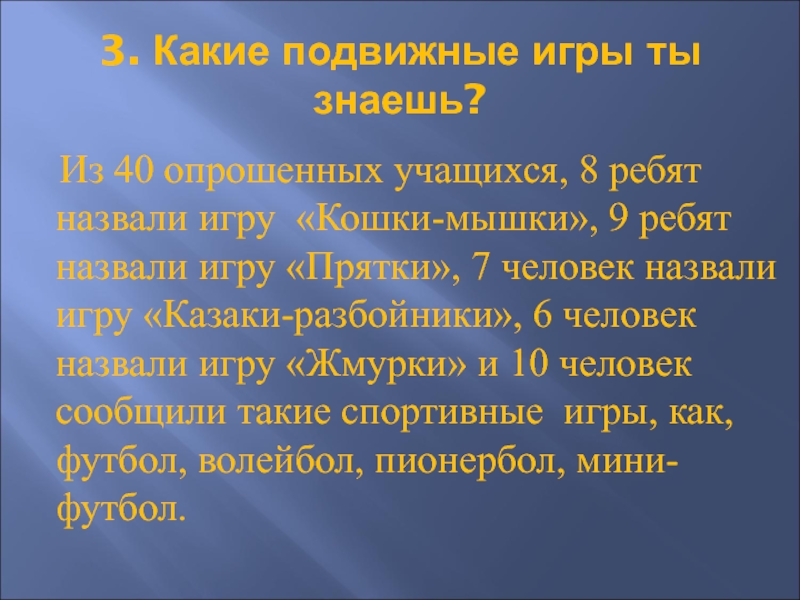 8 ребят назвали игру «Кошки-мышки», 9 ребят назвали игру «Прятки», 7 человек назвали игру «Казаки-разбойники», 6 человек назвали игру «Жмурки» и 10 человек сообщили такие спортивные игры, как, футбол, волейбол, пионербол, мини-футбол.