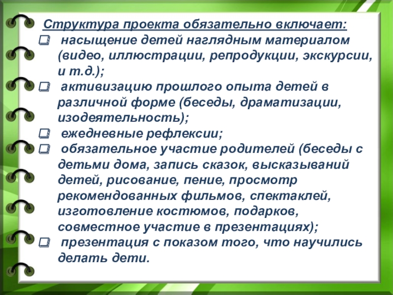 обязательное участие родителей (беседы с детьми дома, запись сказок, высказываний детей, рисование, пение, просмотр рекомендованных фильмов, спектаклей, изготовление костюмов, подарков, совместное участие в презентациях);