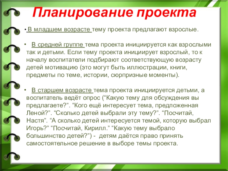 В старшем возрасте тема проекта инициируется детьми, а воспитатель ведёт опрос (“Какую тему для обсуждения вы предлагаете?”. “Кого ещё интересует тема, предложенная Леной?”. “Сколько детей выбрали эту тему?”. “Посчитай, Настя”. “А сколько детей интересуется темой, которую выбрал Игорь?” “Посчитай, Кирилл.” “Какую тему выбрало большинство детей?”) - детям даётся право принять самостоятельное решение в выборе темы проекта.