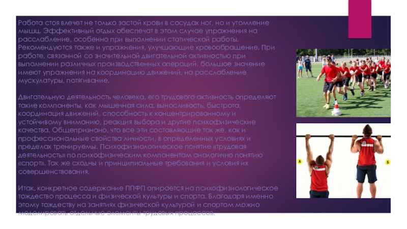 Итак, конкретное содержание ППФП опирается на психофизиологическое тождество процесса и физической культуры и спорта. Благодаря именно этому тождеству на занятиях физической культурой и спортом можно моделировать отдельные элементы трудовых процессов.