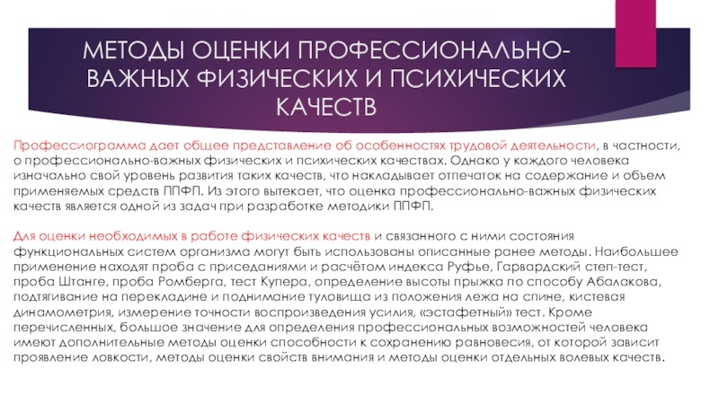 Слайд 9МЕТОДЫ ОЦЕНКИ ПРОФЕССИОНАЛЬНО-ВАЖНЫХ ФИЗИЧЕСКИХ И ПСИХИЧЕСКИХ КАЧЕСТВ