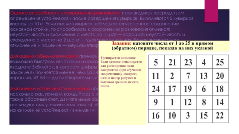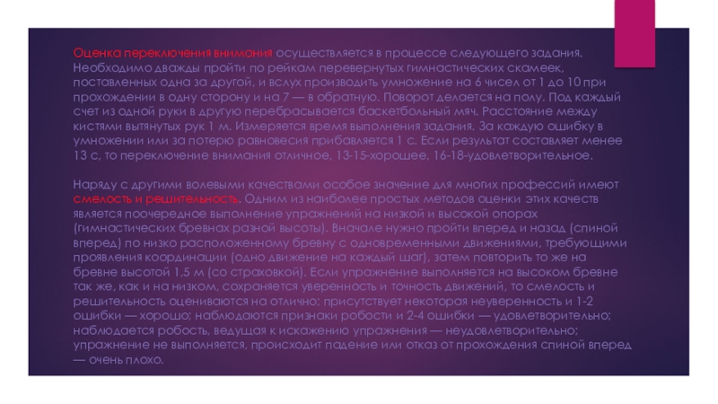 по рейкам перевернутых гимнастических скамеек, поставленных одна за другой, и вслух производить умножение на 6 чисел от 1 до 10 при прохождении в одну сторону и на 7 — в обратную. Поворот делается на полу. Под каждый счет из одной руки в другую перебрасывается баскетбольный мяч. Расстояние между кистями вытянутых рук 1 м. Измеряется время выполнения задания. За каждую ошибку в умножении или за потерю равновесия прибавляется 1 с. Если результат составляет менее 13 с, то переключение внимания отличное, 13-15-хорошее, 16-18-удовлетворительное.