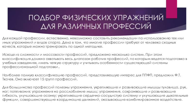Слайд 12ПОДБОР ФИЗИЧЕСКИХ УПРАЖНЕНИЙ ДЛЯ РАЗЛИЧНЫХ ПРОФЕССИЙ