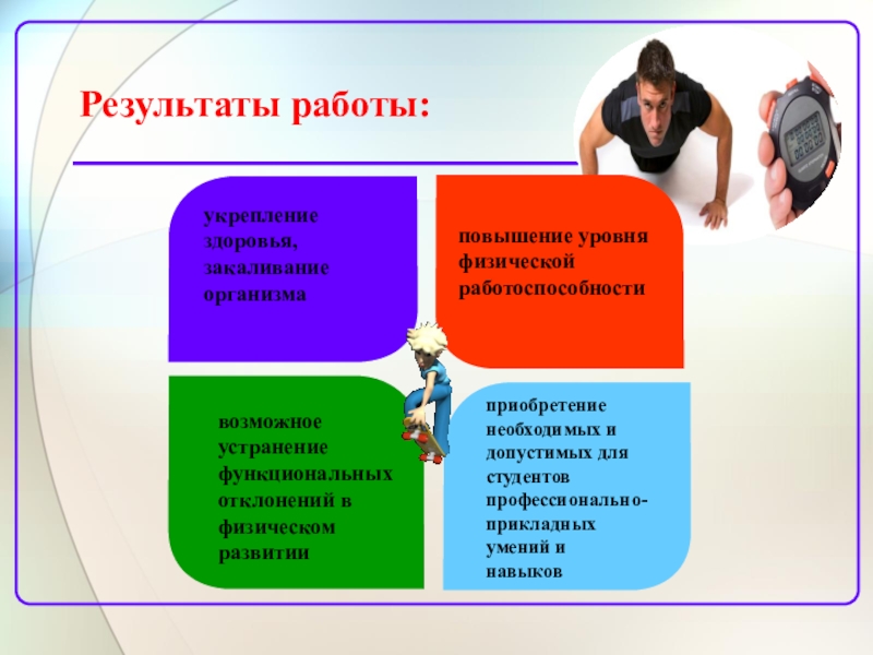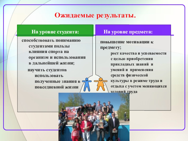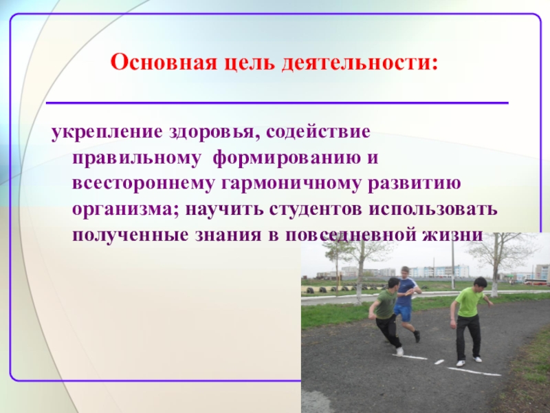 способствовать пониманию студентами пользы влияния спорта на организм и использования в дальнейшей жизни;
