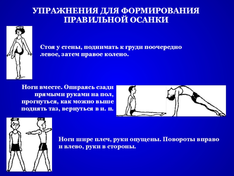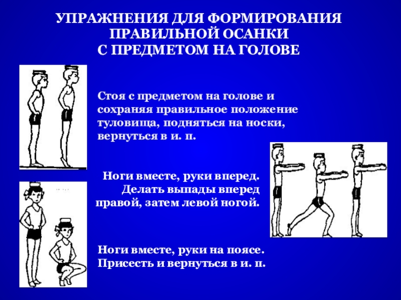 Кисти рук соединить за спиной. Поднять голову, плечи и ноги; прогнуться, вернуться в и. п.