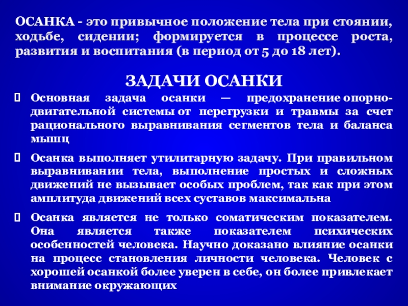 Основная задача осанки — предохранение опорно-двигательной системы от перегрузки и травмы за счет рационального выравнивания сегментов тела и баланса мышц