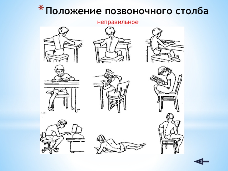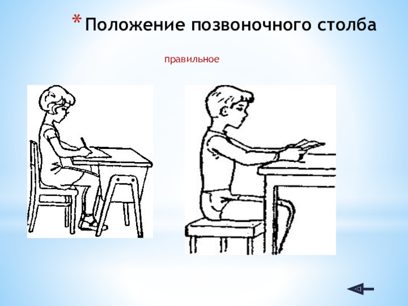 1.При выполнении письменных и устных уроков опираться о спинку стула спиной.Стараться сидеть прямо, не наклоняя вперед голову или верхнюю часть туловища,чтобы не напрягать мышцы.