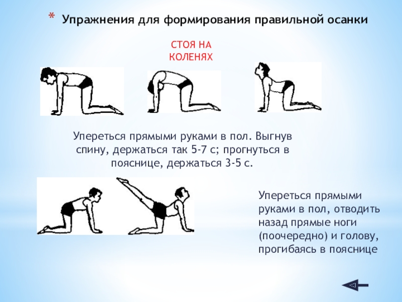 Упереться прямыми руками в пол, отводить назад прямые ноги (поочередно) и голову, прогибаясь в пояснице