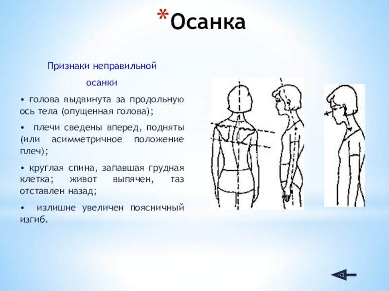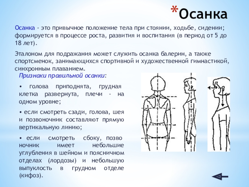 • если смотреть сзади, голова, шея и позвоночник составляют прямую вертикальную линию;