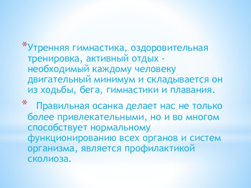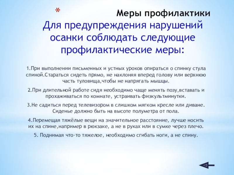 Для предупреждения нарушений осанки соблюдать следующие профилактические меры: